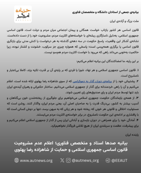 بیانیه صدها تن از اساتید دانشگاه امیرکبیر: بی اعتبار دانستن قانون اساسی جمهوری اسلام و پشتیبانی از برنامه ی دوران گذار شاهزاده رضاپهلوی