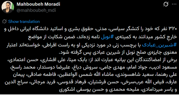 در ۲۴ ساعت گذشته نامهای سرگشاده با بیش از ۳۲۰ امضا از سوی شماری از افراد شناختهشده در داخل و خارج از کشور برای انتشار به دست تحریریهٔ «خبرنامهٔ گویا» رسید که در آن از کمیتهٔ نوبل خواسته شده بود «اعتبار معنوی جایزهٔ صلح نوبل از شیرین عبادی پس گرفته شود». همین عنوان بهاندازهٔ کافی پرسشبرانگیز بود؛ نه فقط به این دلیل که چنین درخواستی از نظر حقوقی معنایی ندارد، بلکه چون ادبیات نامه بیشتر به یک بیانیهٔ سیاسی جناحی شباهت داشت تا یک نقد حقوق بشری.